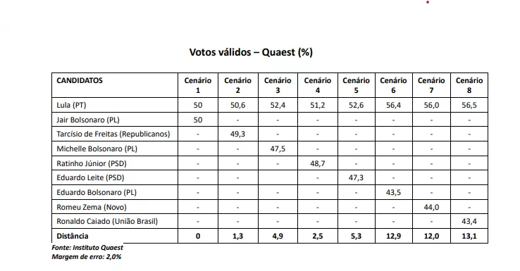 Ainda que o desempenho de Jair Bolsonaro e Michelle anime o bolsonarismo a insistir em ser cabeça-de-chapa em 2026, quando analisamos as simulações de segundo turno da pesquisa Quaest considerando os votos válidos, três governadores apresentam maior competitividade contra Lula: Tarcísio de Freitas, Ratinho Júnior e Eduardo Leite.
